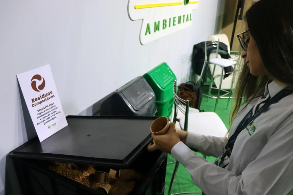 Os copos de café e as pazinhas para misturar o açúcar eram compostáveis, prontos para serem descartados em uma composteira presente no estande, que chamou atenção de quem passava. Os convidados do estande eram orientados a descartar o seu próprio copo de café na composteira, para participarem do processo de sustentabilidade.